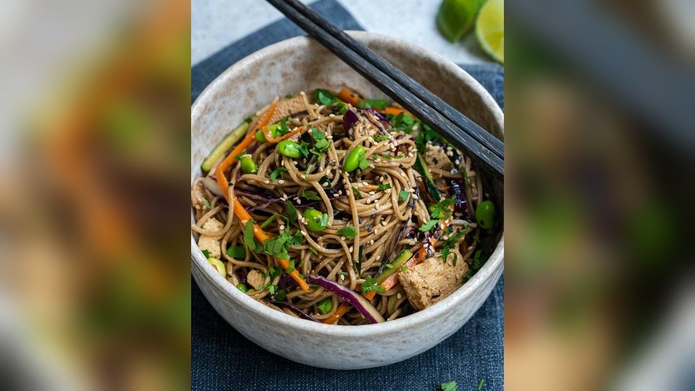 This meal is low in calories but high in fiber. Fiber helps your digestion and keeps you full longer. Eating fiber-rich foods can control your weight better. Vegan soba noodles make a light but satisfying plate.