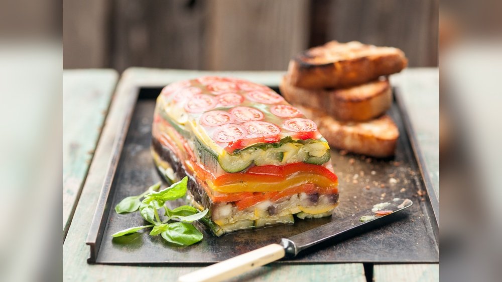 A veggie terrine is a layered vegetable dish. It is often served cold and sliced. It’s colorful, healthy, and visually appealing.
