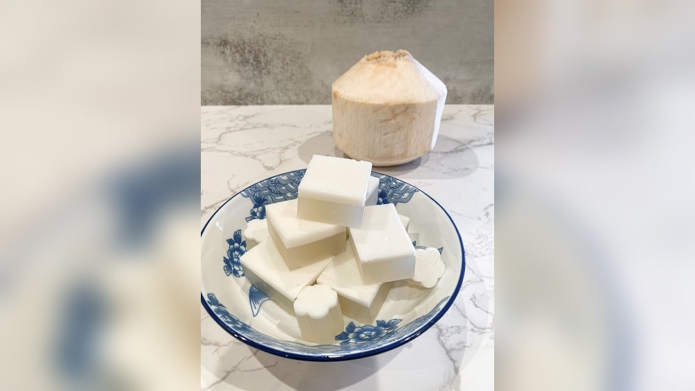 The flesh should be white and soft, not dry or brown. Soft flesh blends well in jelly. Hard flesh makes the jelly chewy. Use a spoon to check the texture after opening the coconut.
